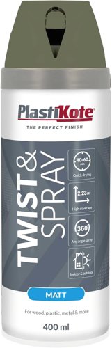 This PlastiKote Twist & Spray Matt 400ml, in Olive Green, gives an enhanced, consistent coverage. The easy spray technology provides added control to make spray painting easier, faster and cleaner.